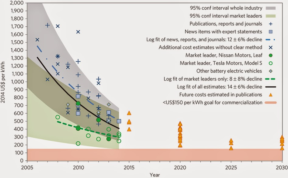 A summary paper in Nature, presents an original systematic review, analysing over 80 different estimates reported 2007–2014 to systematically trace the costs of Li-ion battery packs for BEV manufacturers. We show that industry-wide cost estimates declined by approximately 14% annually between 2007 and 2014, from above US$1,000 per kWh to around US$410 per kWh, and that the cost of battery packs used by market-leading BEV manufacturers are even lower, at US$300 per kWh, and has declined by 8% annually. Learning rate, the cost reduction following a cumulative doubling of production, is found to be between 6 and 9%, in line with earlier studies on vehicle battery technology. We reveal that the costs of Li-ion battery packs continue to decline and that the costs among market leaders are much lower than previously reported. This has significant implications for the assumptions used when modelling future energy and transport systems and permits an optimistic outlook for BEVs contributing to low-carbon transport.